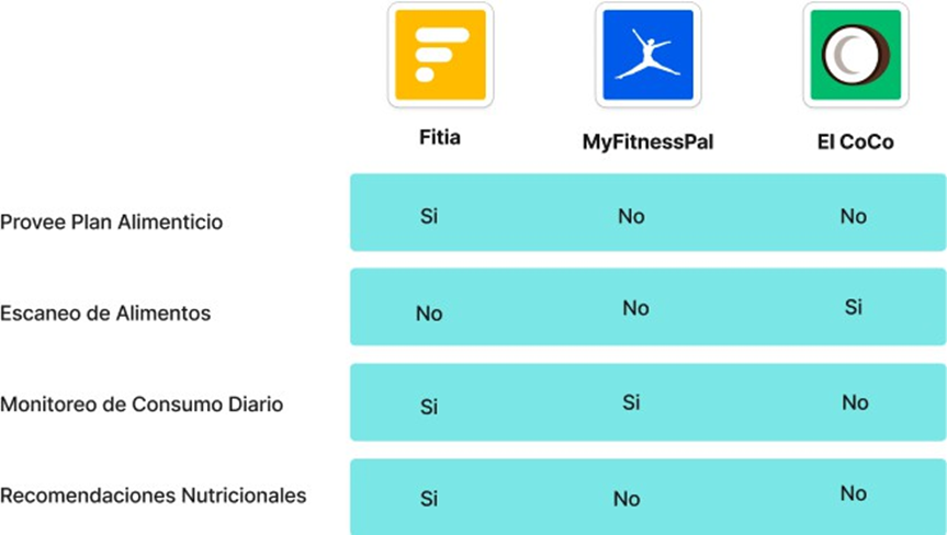 Asimismo, el análisis de la competencia muestra un panorama actual de las aplicaciones existentes en el mercado relacionadas con la planificación alimentaria. Cada una ofrece características particulares, desde el escaneo de productos hasta el seguimiento de hábitos alimenticios, lo que demuestra el creciente interés por soluciones tecnológicas que ayuden a mejorar la calidad de vida de las personas. Esta evaluación permite identificar oportunidades de mejora y nichos poco atendidos, sirviendo de base para el diseño de una aplicación que combine alimentación consciente, tecnología avanzada y personalización efectiva.