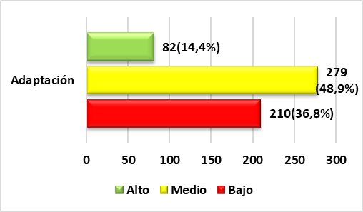 En la figura 2, se puede observar que, 14,4 %(n=82) de los participantes tiene un alto nivel de funcionalidad familiar con respecto a su dimensión adaptación, 48,9 %(n=279) una funcionalidad media y 36,8 %(n=210) tiene una funcionalidad baja.