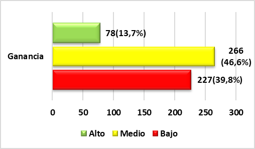 En la figura 4, podemos observar que, 13,7 %(n=78) de los participantes tienen un nivel alto de funcionalidad familiar en cuanto a su dimensión ganancia, 46,6 %(n=266) una funcionalidad media y 39,8 %(n=227) una funcionalidad familiar baja.