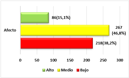 En la figura 5, podemos observar que, 15,1 %(n=86) de los participantes tienen un nivel alto de funcionalidad familiar con respecto a su dimensión afecto, 46,8 %(n=267) una funcionalidad familiar media y 38,2 %(n=218) una funcionalidad familiar baja.