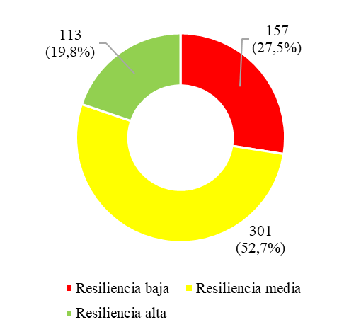 En la figura 1, se puede observar que, 27,5 % (n=157) de los participantes tienen una resiliencia baja, 52,7 % (n=301) resiliencia media y 19,8 % (n=113) resiliencia alta.