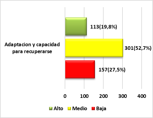 En la figura 4, podemos observar, que el 19,8 % (n=113) tienen una resiliencia alta con respecto a su dimensión adaptación y capacidad para recuperarse, 52,7 % (n=301) resiliencia media y 27,5 % (n=157) resiliencia baja.