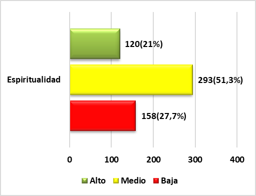 En la figura 6, podemos observar que el 21 %(n=10) de los participantes tienen una resiliencia alta con respecto a su dimensión espiritualidad, 51,3 %(n=293) una resiliencia media y (27,7 % (n=158) una resiliencia baja