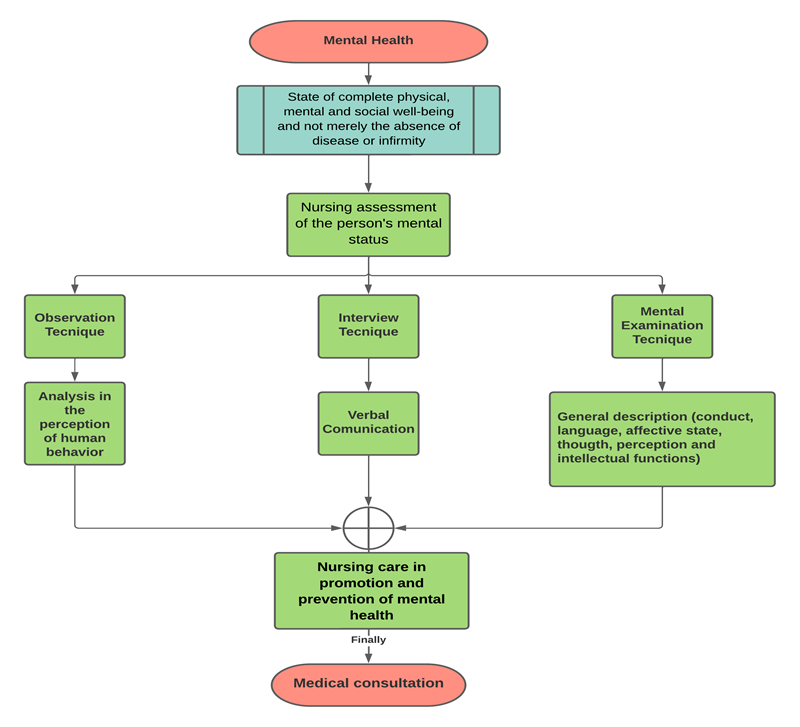 Once the three procedures for assessing the person's mental health have been carried out, the nursing professional will promote and prevent factors that compromise mental health, and finally refer the person to a medical consultation to determine whether or not their mental health is impaired.