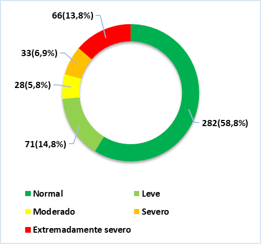 We can see in figure 2 that 39,8 % (n=191) of participants have a normal level of depression, 13,5 % (n=65) have mild depression, 27,1 % (n=130) have moderate depression, 4,8 % (n=23) have severe depression, and 14,8 % (n=71) have extremely severe depression.
