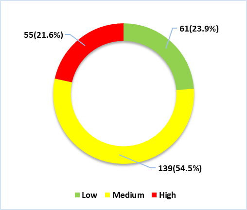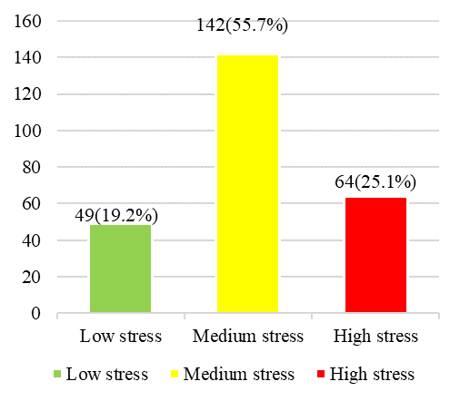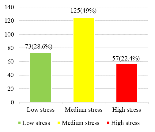 In figure 2, we can see that 23,9 % (n=61) of participants have low stress levels, 54,5 % (n=139) have medium stress levels, and 21,6 % (n=55) have high stress levels.