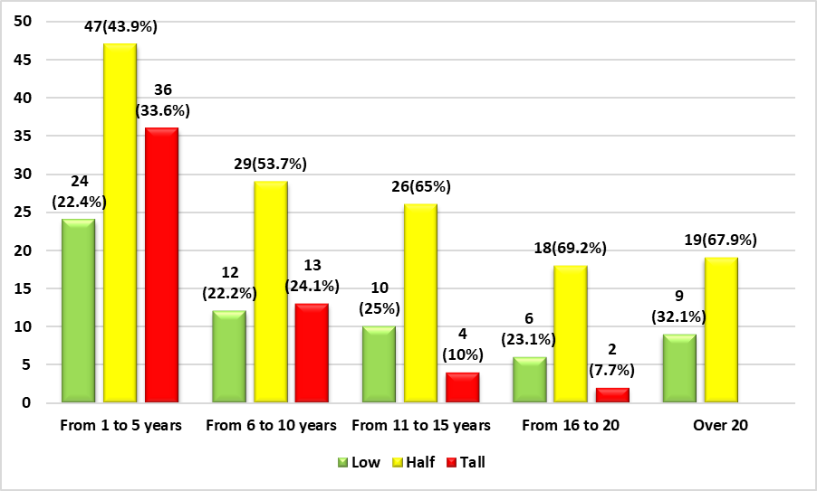 In figure 6, we can see that 22,4 % (n=24) of participants who have been in service for 1 to 5 years have a low level, 43,9 % (n=47) have a medium level, and 33,6 % (n=36) have a high level. Among participants who have been in service for 6 to 10 years, 22,2 % (n=12) of participants have a low level of stress, 53,7 % (n=29) have a medium level, and 24,1 % (n=13) have a high level of stress. As for participants who have been in service for 11 to 15 years, 25 % (n=10) have a low level of stress, 65 % (n=26) have a medium level of stress, and 10 % (n=4) have a high level of stress. Among participants who have been in service for 16 to 20 years, 23,1 % (n=6) have a low level of stress, 69,2 % (n=18) have a medium level of stress, and 7,7 % (n=2) have a high level of stress. As for participants who have been in service for more than 20 years, 32,1 % (n=9) have low stress levels and 67,9 % (n=19) have medium stress levels.