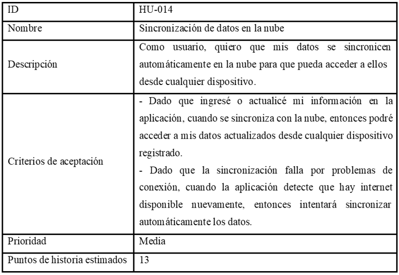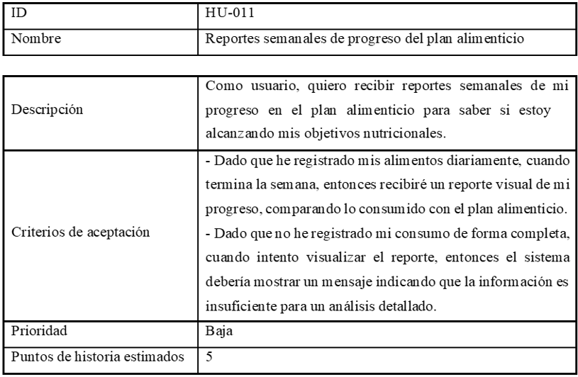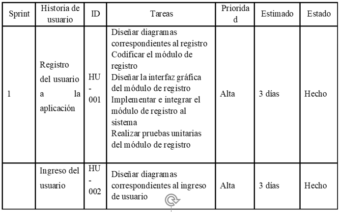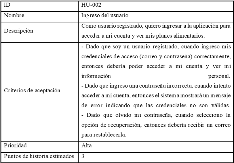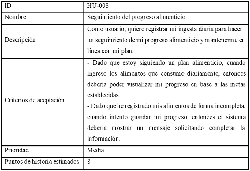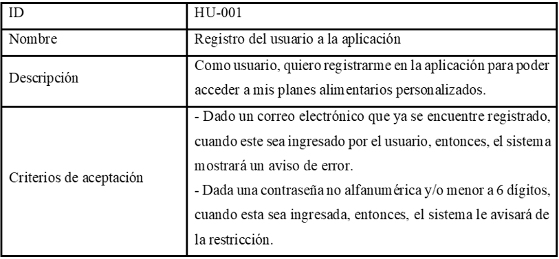 The following is the description of the system developed for the planning and monitoring of eating habits through a mobile application. The Product Backlog is presented, which contains the user stories necessary for the development of the system, each one of them with its priority and effort estimation (Story Points).