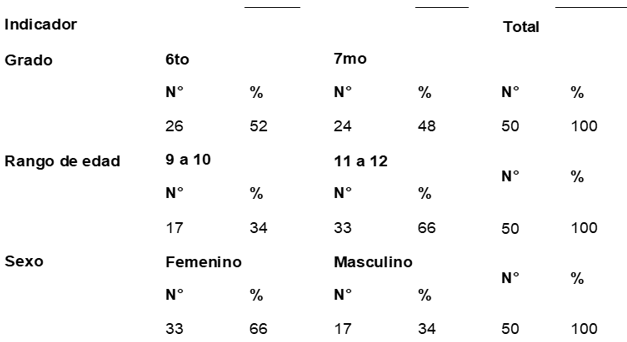 Sobre el objetivo Determinar datos sociodemográficos de los niños de sexto a séptimo grado del CADE, Santo Domingo, en el año 2024, los resultados obtenidos revelan una distribución equilibrada en términos de nivel educativo, con un 52 % en sexto grado y un 48 % en séptimo grado. En cuanto a la edad, se observa que el 34 % de los participantes tienen entre 9 y 10 años, mientras que el 66 % se encuentran en el rango de 11 a 12 años. Es importante destacar que, según el sistema educativo ecuatoriano, la edad típica para cursar sexto y séptimo grado oscila entre los 10 y 12 años, lo que indica que la mayoría de los estudiantes se encuentran dentro del rango de edad esperado, reflejando coherencia con las edades típicas para estos niveles educativos en el país.(7,8)