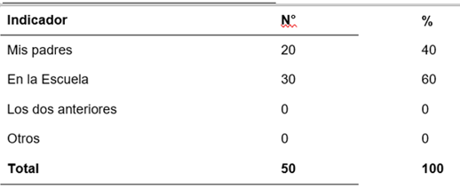 En la figura 4, referente a la fuente de información sobre el lavado de manos, se evidencia que el 40 % de los participantes señaló haber recibido información de sus padres, mientras que el 60 % indicó que esta les fue proporcionada en la escuela.