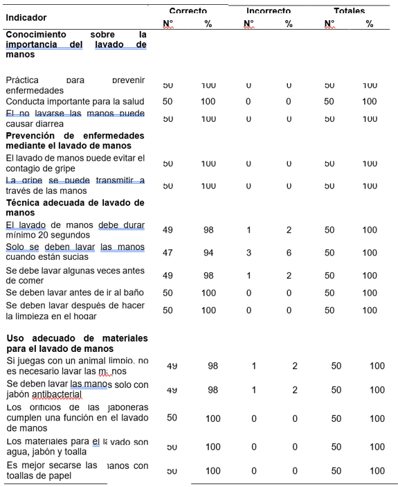 Asimismo, se identificó que el conocimiento sobre el lavado de manos en escolares se basa principalmente en la experiencia práctica adquirida a partir de su entorno. Sin embargo, muchos niños no aplican la técnica recomendada de manera adecuada, realizándola de forma rápida y sin cubrir todas las áreas o respetar el tiempo necesario. Factores como la disponibilidad de recursos en la escuela y las normas sociales también influyen en estos hábitos. Por ello, es fundamental complementar el aprendizaje empírico con educación formal que garantice la adopción de prácticas efectivas para la prevención de enfermedades infecciosas.