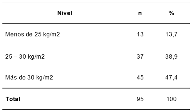 La figura 3 muestra la distribución de los participantes según su Índice de Masa Corporal (IMC). De los 95 individuos estudiados, el 47,4 % presenta un IMC superior a 30 kg/m², lo que los clasifica en la categoría de obesidad. Un 38,9 % de los participantes tiene un IMC entre 25 y 30 kg/m², ubicándose en la categoría de sobrepeso. Finalmente, solo el 13,7 % de los encuestados tiene un IMC inferior a 25 kg/m², lo que se considera un peso normal. Estos resultados destacan que una proporción significativa de la población estudiada está en un rango de sobrepeso u obesidad, factores de riesgo importantes para el desarrollo de diabetes mellitus tipo 2. La alta prevalencia de sobrepeso y obesidad en esta comunidad subraya la necesidad de intervenciones enfocadas en la prevención y manejo del peso para reducir el riesgo de desarrollar esta enfermedad crónica.(21,22,23)