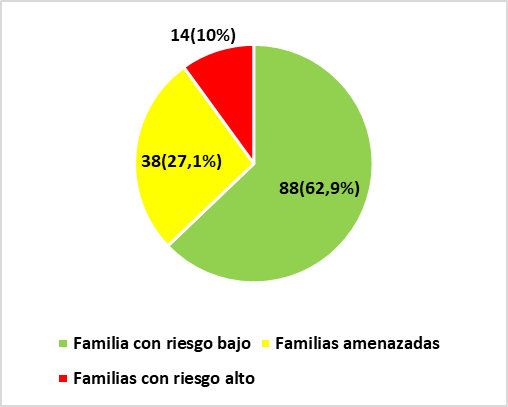 En la figura 1, se puede observar que, el 62,9 % de los participantes tienen una familia con riesgo bajo, el 27,1 % tienen familias amenazadas y 10 % tienen familias con riesgo alto.