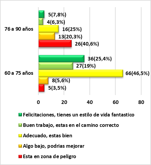 En la figura 4, podemos observar que, el 7,8 %(n=5) de los adultos mayores entre las edades de 76 a 90 años tienen un estilo de vida fantástico, 6,3 %(n=4) están haciendo un buen trabajo en su estilo de vida, 25 %(n=16) tienen un estilo de vida adecuado, 20,3 %(n=13) tienen un estilo de vida algo bajo y 40,6 %(n=26) su estilo de vida se encuentra en zona de peligro; en cuanto a los adultos mayores entre las edades de 60 a 75 años, el 25,4 %(n=36) tienen un estilo de vida fantástico, 19 %(n=27) están haciendo un buen trabajo en su estilo de vida, 46,5 %(n=66) tienen un estilo de vida adecuado, 5,6 %(n=8) tienen un estilo de vida algo bajo y 3,5 %(n=5) su estilo de vida se encuentra en zona de peligro.