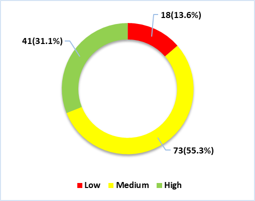 We can see in figure 2 that 13,6 % (n=18) of participants have a low quality of life, 55,3 % (n=73) have an average quality of life, and 31,1 % (n=41) have a high quality of life.