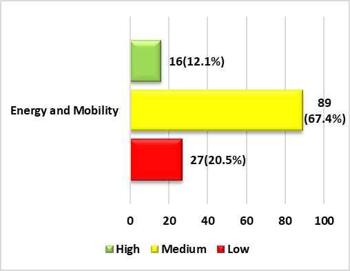 In figure 3, we can see that 12,1 % (n=16) of participants have a high quality of life in terms of energy and mobility, 67,4 % (n=89) have an average quality of life, and 20,5 % (n=27) have a low quality of life.