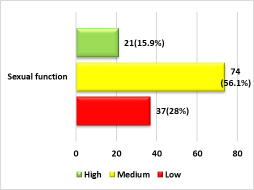Figure 7 shows that 15,9 % (n=21) of participants have a high quality of life in terms of sexual function, 56,1 % (n=74) have an average quality of life, and 28 % (n=37) have a low quality of life.