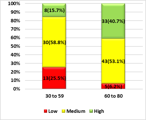 In figure 8, we can see that 15,7 % (n=8) of participants between the ages of 30 and 59 have a high quality of life, 58,8 % (n=30) have an average quality of life, and 25,5 % (n=13) have a low quality of life. and participants between the ages of 60 and 80, 40,7 % (n=33) have a high quality of life, 53,1 % (n=43) have an average quality of life, and 6,2 % (n=5) have a low quality of life.