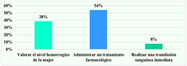 Sixty-two percent of the nurses surveyed were unaware of the interventions that should be performed in cases where a patient presents postpartum hemorrhage due to uterine atony, as they mentioned that the first step in care is to administer drugs and perform a blood transfusion. On the other hand, 38 % do know the subject with certainty, mentioning that it is first necessary to assess the woman's level of bleeding, as shown in figure 2.(22)