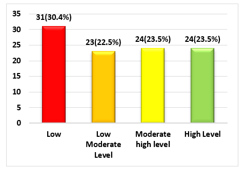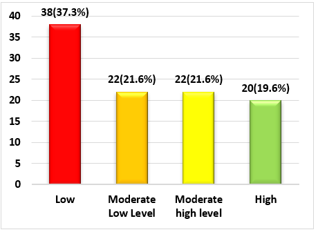 En la figura 1, podemos observar que, el 26,5 % de los profesionales de enfermería tienen un nivel de empatía bajo, 24,5 % nivel de empatía moderado bajo, 25,5 % nivel de empatía moderado alto y el 23,5 % nivel de empatía alto.