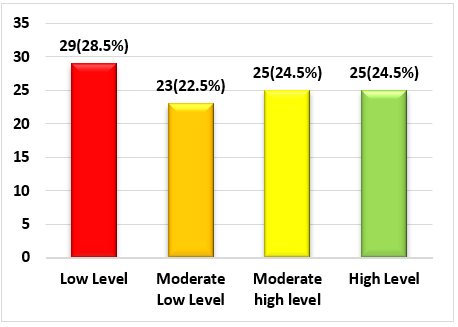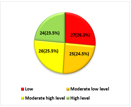 In figure 1, we can see that 26,5 % of nursing professionals have a low level of empathy, 24,5 % have a moderate-low level of empathy, 25,5 % have a moderate-high level of empathy, and 23,5 % have a high level of empathy.