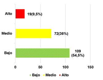En la figura 1, podemos observar que, el 45,5 % de los participantes tienen un nivel de estrés bajo, 44 % estrés medio y 10,5 % estrés alto.