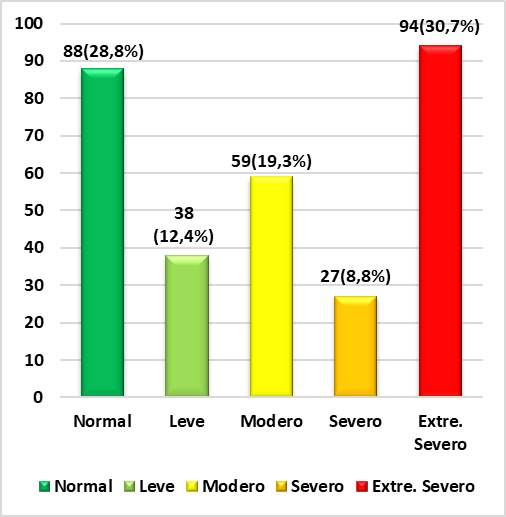En la figura 2, podemos observar que, los participantes con respecto a la dimensión depresión, el 28,8 % (n=88) tiene una depresión normal 12,4 % (n=38) una depresión leve, 19,3 % (n=59) una depresión moderada, 8,8 % (n=27) una depresión severa y 30,7 % (n=94) una depresión extremadamente severa.