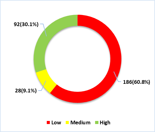 In figure 1, we can see that, with regard to the mental health of the participants, 60,8 % (n=186) have poor mental health, 9,1 % (n=28) have average mental health, and 30,1 % (n=92) have good mental health.