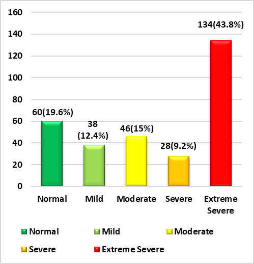 In figure 2, we can see that, with regard to depression, 28,8 % (n=88) of participants have normal depression, 12,4 % (n=38) have mild depression, 19,3 % (n=59) have moderate depression, 8,8 % (n=27) have severe depression, and 30,7 % (n=94) have extremely severe depression.