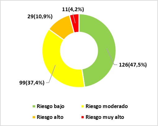 En la figura 2, podemos observar que, el 47,5 %(n=126) de los participantes con hipertensión tienen un riesgo cardiovascular muy bajo, 37,4 %(n=99) un riesgo cardiovascular moderado, 10,9 %(n=29) riesgo cardiovascular alto y 4,2 %(n=11) riesgo cardiovascular muy alto.