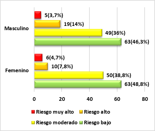En la figura 3, se puede observar en relación al sexo que, en el sexo masculino, el 3,75(n=5) tienen un riesgo cardiovascular muy alto, 14 %(n=19) un riesgo cardiovascular alto, 36 %(n=49) un riesgo cardiovascular moderado y 46,3 %(n=63) un riesgo cardiovascular bajo; y en el sexo femenino, el 4,7 %(n=6) tienen un riesgo cardiovascular muy alto, 7,8 %(n=10) un riesgo cardiovascular alto, 38,8 %(n=50) un riesgo cardiovascular moderado y 48,8 %(n=63) un riesgo cardiovascular bajo.